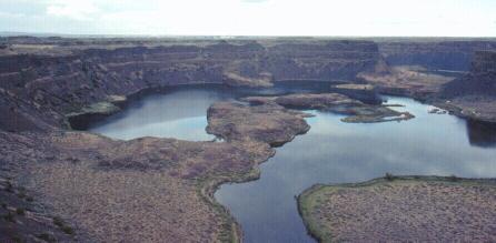 Dry Falls, a 350-foot high, 3-mile-wide waterfall carved into Columbia Plateau basalts during releases from the Lake Missoula floods.