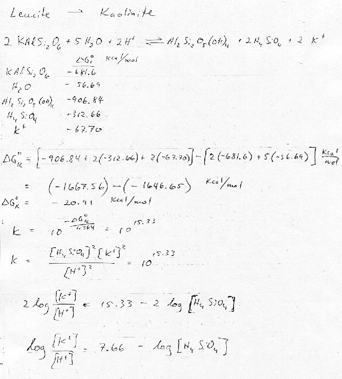 1. Calculate K for the weathering reaction of leucite (KAlSi2O6) to kaolinite, using delta-G°f values in the appendix of Faure. Assume excess silica exists in solution as silicic acid H4SiO4. Derive the equation of the equilibrium line for this reaction, where the y-axis is log ([K+]/[H+]) and the x-axis is log [H4SiO4].